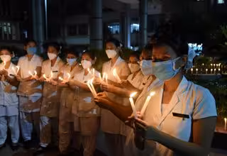 01 July 2021, India, Guwahati: Nurses attend a candlelight ceremony to pay a tribute to the doctors who died because of the coronavirus (COVID-19) on the occasion of the National Doctors' Day in India. Photo: Dasarath Deka/ZUMA Wire/dpa