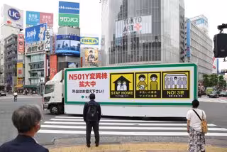 24 May 2021, Japan, Tokyo: A truck with the note "N501Y Coronavirus variation is spreading, please refrain from going outside!" drives around Shibuya Station in Tokyo. Four of these trucks organized by the Tokyo City Government to inform the public on t