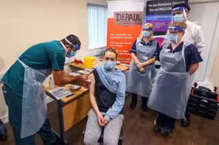 13 January 2021, England, Oldham: Kelly Heney receives an injection of a Covid-19 vaccine at the Depaul UK homeless shelter in Oldham. Photo: Peter Byrne/PA Wire/dpa - Peter Byrne/PA Wire/dpa