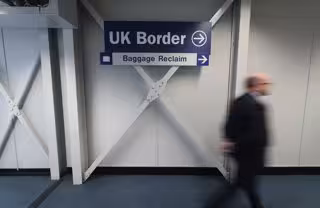 11 June 2020, Northern Ireland, Belfast: A man passes a UK border sign at Belfast International Airport which reopens on 15 June 2020. Photo: Niall Carson/PA Wire/dpa