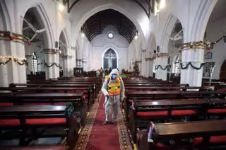 24 December 2020, Pakistan, Peshawar: A rescue worker sprays chlorine water at all the areas for disinfecting as a preventive measure against the coronavirus (Covid-19), ahead of the Christmas eve mass at St. John's Cathedral Church. Photo: -/PPI via ZU