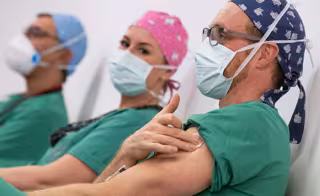 18 January 2021, Belgium, Binche: Staff member of the CHU Tivoli polyclinic receive doses of Moderna Coronavirus (Covid-19)vaccine. Belgium started to administer the vaccine of American biotech company Moderna in four hospitals for the members of the s - Benoit Doppagne/BELGA/dpa