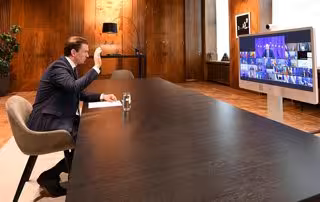 25 February 2021, Austria, Vienna: Austrian Chancellor Sebastian Kurz takes part via videolink in a special EU summit of heads of state and governments. Photo: Helmut Fohringer/APA/dpa
