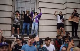 27 June 2021, United Kingdom, London: People gather in Whitehall Street during a #FreedomToDance march organised by Save Our Scene, in protest of the government's perceived disregard for the live music industry throughout the coronavirus pandemic. Photo