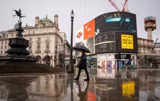 29 January 2021, United Kingdom, London: A man with an umbrella walks past a government coronavirus advert on the big screen at Piccadilly Circus during England's third national lockdown to curb the spread of coronavirus. Photo: Dominic Lipinski/PA Wire