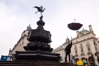 29 January 2021, United Kingdom, London: David Field throws an umbrella into the air, as he takes advantage of a near empty Piccadilly Circus during England's third national lockdown to curb the spread of coronavirus. Photo: Dominic Lipinski/PA Wire/dpa - Dominic Lipinski/PA Wire/dpa