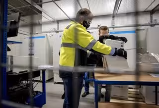 26 December 2020, Netherlands, Oss: Employees unpack the first doses of Pfizer/BioNTech coronavirus vaccines to be stored in a freezer of the company Movianto in the industrial park Vorstengrafdonk. The vaccines come from the Pfizer factory in Puurs, a