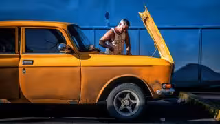 Un conductor arregla su viejo Moskvich 2140 de fabricación rusa en una gasolinera cerca de Aguada de Pasajeros, Cienfuegos, Cuba.