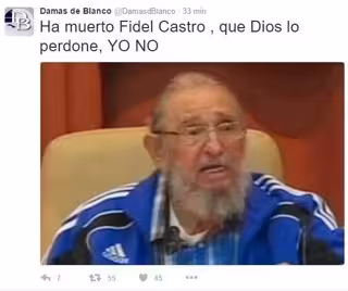La asociación de familiares de represaliados cubanos Damas de Blanco ha recogido en su cuenta de Twitter (@DamasdBlanco) la muerte de Fidel Castro y ha expresado su intención de no perdonarle.