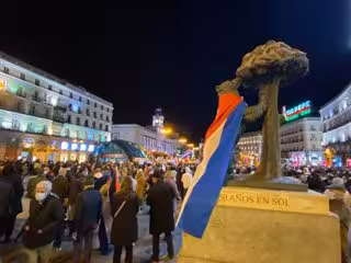 La mítica estatua de El Oso y el Madroño también ha sido testigo de la reivindicación y es que, además, como si de una capa se tratase, le han anudado una bandera cubana.
