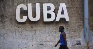 30 April 2020, Cuba, Havana: A man wearing a face mask walks past a sign reading 'CUBA'. Labour Day Parade has been cancelled in Cuba amid the coronavirus pandemic. Photo: Guillermo Nova/dpa - Guillermo Nova/dpa - Archivo
