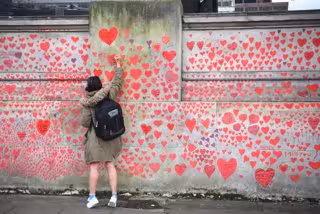 Archivo - 08 April 2021, United Kingdom, London: A woman draws a heart on the National Covid Memorial Wall which commemorates people who died in the UK from coronavirus. Photo: Victoria Jones/PA Wire/dpa
