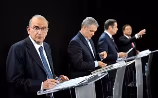 Duque, abanderado del Centro Democrático, ganaría con un 34 por ciento, 1,4 puntos menos que en la encuesta anterior, publicada en abril. Es su primera caída desde que comenzó la campaña presidencial, ya que en febrero sumaba un 8 por ciento y en marzo un 22 por ciento.