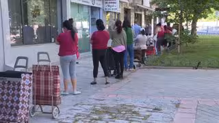 Cola de personas esperando a recibir alimentos y productos de primera necesidad, repartidos por la asociación de vecinos Manzanares-Casa de Campo a familias vulnerables.