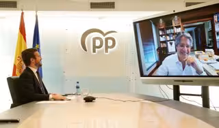El líder del PP, Pablo Casado, conversa por vía telemática con el presidente electo de la República de Ecuador, Guillermo Lasso.