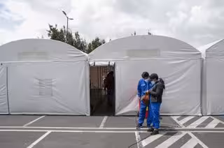 15 January 2021, Ecuador, Quito: Two patients check their PCR results outside the improvised tents in front of the Iess South Hospital were tested for the coronavirus. Photo: Juan Diego Montegro/ - Juan Diego Montegro/ DPA