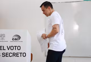 QUITO, Nov. 17, 2025  -- Ecuadorian President Daniel Noboa votes at a polling station in Olon, Santa Elena province, Ecuador, Nov. 16, 2025. Ecuadorians voted against allowing the return of foreign military bases to the country in a constitutional referen