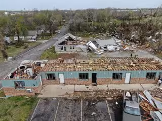 Archivo - April 2, 2025, Nevada, Missouri, USA: The Oaks student housing center, foreground, and other nearby structures in Nevada, Missouri, sustained heavy damage when they were hit by a tornado that tore through the town on Wednesday morning, April 2,