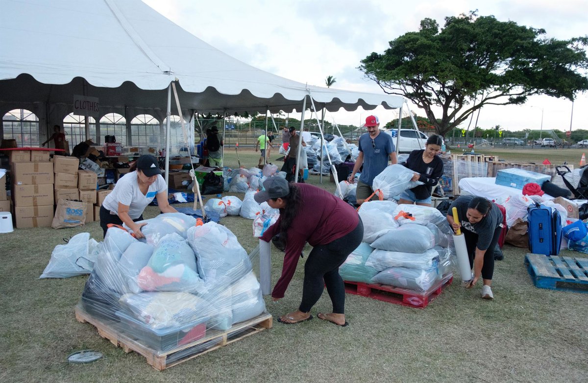 August 11, 2023 - Kuta, Hawaii, USA - Volunteers palletize and wrap enormous quantities of supplies freely donated by the Maui community and beyond. The donations range from soup to nuts and everything in betweenclothing, household items, first aid sup - Europa Press/Contacto/Jaye Matt