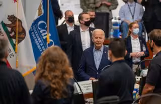 13 September 2021, US, Sacramento: US President Joe Biden (C) receives a briefing from local, state, and federal emergency response personnel on the impacts of recent wildfires at the California Governor's Office of Emergency Services (Cal OES) at Sacra
