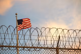 Archivo - Bandera de EEUU en un centro de detención.