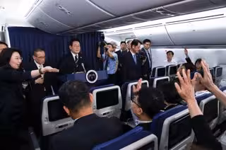 25 August 2025, US, Washington: South Korean President Lee Jae Myung (C) holds a press conference aboard the presidential plane to Washington. Photo: -/yonhap/dpa - -/yonhap/dpa