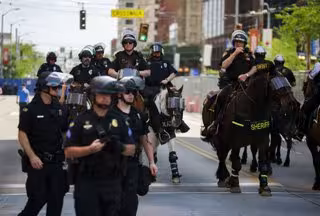 25 May 2019, US, Dayton: Mounted police secure the area around a rally by the white supremacist group KKK and a counter protest by the anti-fascist movement ANTIFA. Photo: Jeremy Hogan/SOPA Images via ZUMA Wire/dpa - Jeremy Hogan/SOPA Images via ZUM / DPA - Archivo