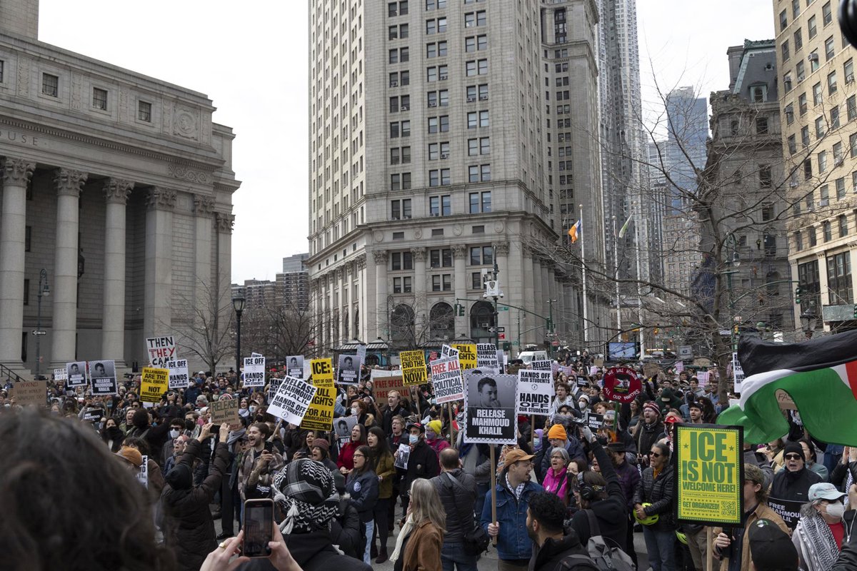 12 March 2025, US, New York: Demonstrators chant and hold signs that read 'ICE IS NOT WELOCME HERE!' 'RELEASE MAHMOUD KHALIL' outside the U.S. Courthouse in Manhattan's Foley Square. Protesters rally to denounce the arrest and detention of Khalil, a Colum