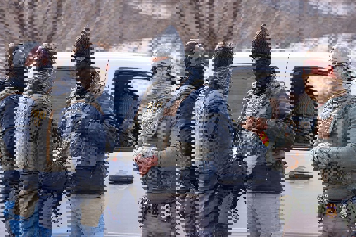 February 17, 2026: ICE agents attempt to confirm two men's legal immigration status after pulling them over on Bottineau Boulevard near 35th Avenue W. in Robbinsdale, Minnesota on Feb. 11, 2026.