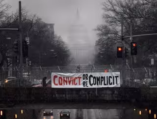 11 February 2021, US, Washington: A general view of a protest sign hangs on the overpass of the Capitol Street as the historic second impeachment trial continues against former USPresident Donald Trump. Photo: Carol Guzy/ZUMA Wire/dpa - Carol Guzy/ZUMA Wire/dpa