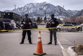 Archivo - Agentes de policía vigilan una de las entradas al lugar de un tiroteo en una tienda de comestibles en Boulder, Colorado.