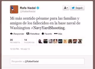 "Mi más sentido pésame para las familias y amigos de los fallecidos en la base naval de Washintong", señala Nadal a través de su cuenta oficial de Twitter @RafaelNadal, en la que tiene más de cinco millones de seguidores.