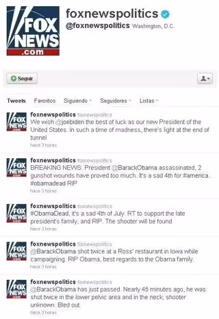 La cuenta de Twitter de la sección de política del canal Fox News (@foxnewspolitics) ha sido utilizada por un grupo de piratas informáticos para distribuir la falsa noticia del asesinato del presidente de Estados Unidos, Barack Obama, precisamente el día de la festividad del 4 de julio. En los 'twits' se hacía mención a la cuenta oficial de Twitter de Obama, por lo que los comentarios han tenido una gran difusión.