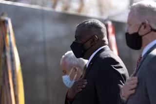 HANDOUT - 29 March 2021, US, Washington: US Defence Secretary Lloyd Austin (C) takes part in a wreath laying ceremony at the Vietnam Veterans Memorial wall during the National Vietnam War Veterans Day. Photo: Lisa Ferdinando/US Secretary of Defence/dpa - Lisa Ferdinando/US Secretary of / DPA