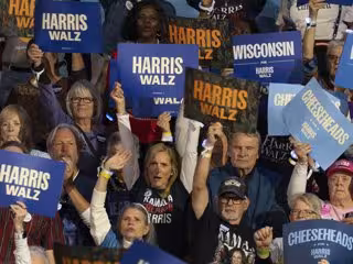 17 October 2024, US, Green Bay: US Presidential candidate and Vice President Kamala Harris supporters raise their banners as Harris rallies a packed house during one of her stops in Wisconsin. Photo: Sue Dorfman/ZUMA Press Wire/dpa - Sue Dorfman/ZUMA Press Wire/dpa