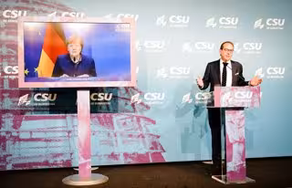 07 January 2021, Berlin: German Chancellor Angela Merkel (on screen) and Alexander Dobrindt, head of the Christian Social Union in Bavaria (CSU) parliamentary group, make a statement on the storming of the US Capitol by Trump supporters in Washington at - Kay Nietfeld/dpa-Pool/dpa