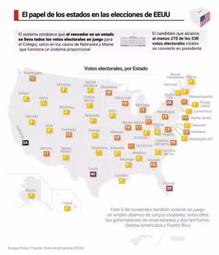 Infografía que muestra un mapa de cuántos votos electorales da cada estado en las elecciones presidenciales que se celebrarán el próximo 5 de noviembre de 2024 en Estados Unidos. El sistema establece que el vencedor en un estado se lleva todos los votos e - Europa Press