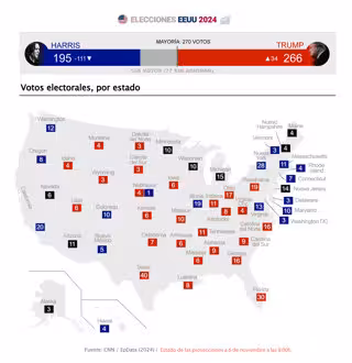 Infografía con el resultado de las elecciones en Estados Unidos, según las proyecciones publicadas hasta las 8:00 horas del 6 de noviembre de 2024. Donald Trump está a punto de regresar a la Casa Blanca cuatro años después de su derrota contra Joe Biden d