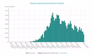 Estos gráficos acompañan a la noticia titulada: Italia se queda a las puertas de los 200.000 contagios con el menor aumento de casos en más de un mes