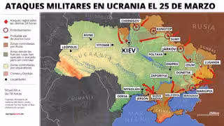 Mapa con ataques militares en Ucrania el 25 de marzo de 2022 (estado a las 18 horas). Las autoridades de Ucrania han asegurado este viernes que el Ejército ha iniciado una contraofensiva en la región de la capital, Kiev, y ha destacado que los principal