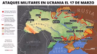 Mapa con ataques militares en Ucrania el 17 de marzo de 2022 (estado a las 18 horas). Al menos un muerto y tres heridos tras un bombardeo en un edificio residencial en el distrito de Darnytskyi, en la capital de Ucrania, Kiev, tras saltar las alarmas en