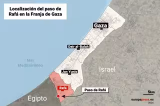 Mapa que representa el paso de Rafá en la Franja de Gaza. El Ejército de Israel ha confirmado la toma de la parte palestina del paso de Rafá, que conecta la Franja de Gaza con Egipto y que sirve como uno de los principales puntos de entrada de ayuda hum - Europa Press
