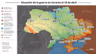 Mapa con la situación de la guerra en Ucrania el 18 de abril de 2022 (Estado a las 10:30 horas). Al menos seis personas han muerto como consecuencia de una serie de ataques con misiles en la ciudad ucraniana de Leópolis, en la zona oeste del país, según - Europa Press