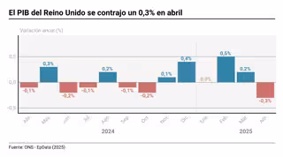 Gráfico con datos de PIB en Reino Unido. El Producto Interior Bruto (PIB) del Reino Unido registró una contracción del 0,3% en el mes de abril en comparación con el mes anterior, cuando la actividad creció un 0,2%, según ha informado este jueves la Oficin