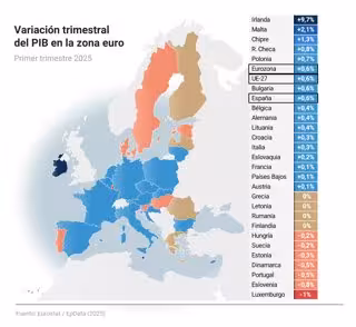 Mapa con variación trimestral del PIB en la zona euro. El crecimiento del producto interior bruto (PIB) se aceleró en la eurozona en el primer trimestre del año al 0,6%, el doble que el 0,3% registrado en los tres últimos meses de 2024 y el mayor ritmo de - Europa Press