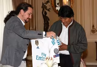 Pablo Iglesias regala a Evo Morales una camiseta del Real Madrid