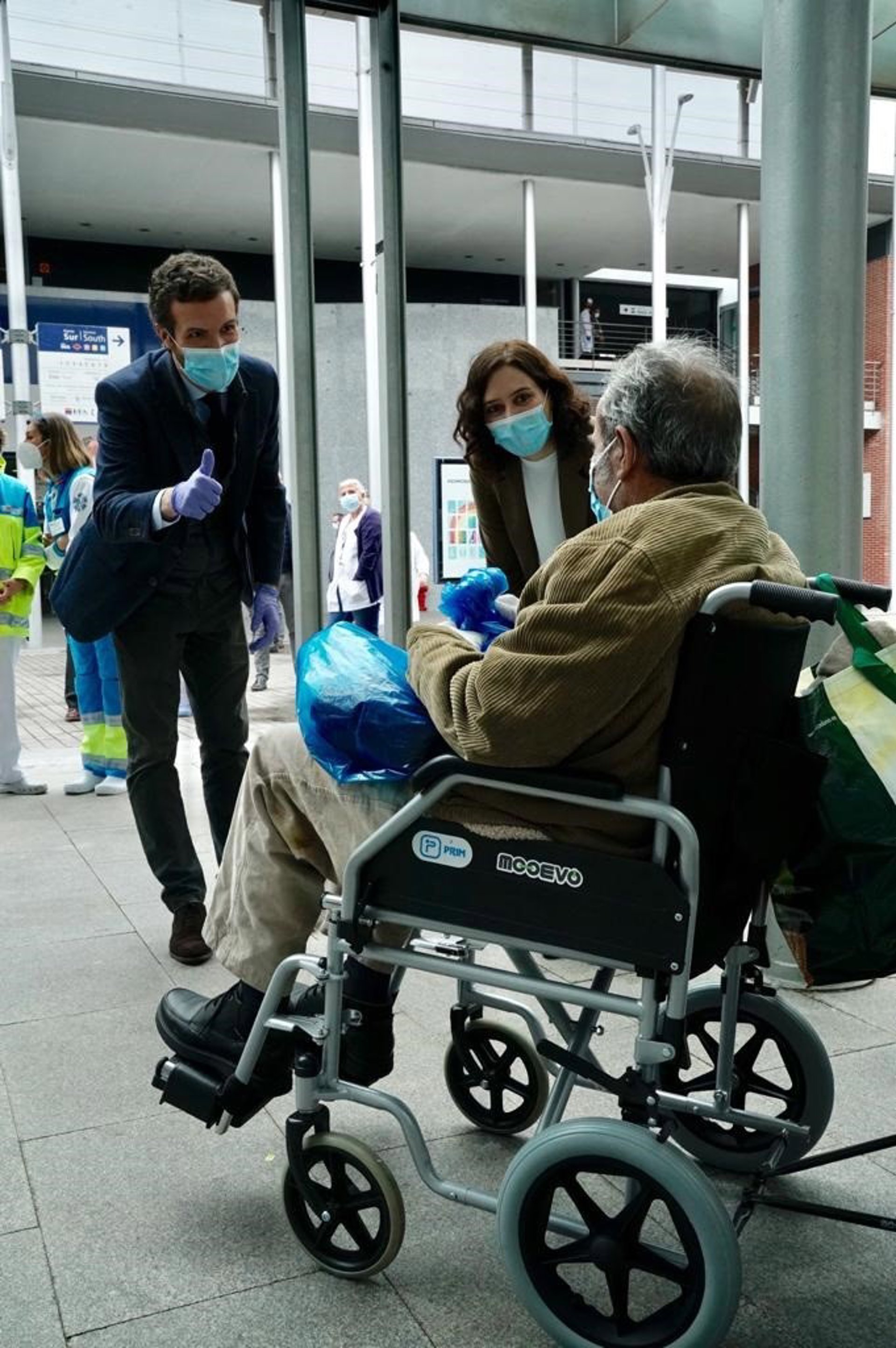 El presidente del PP,  Pablo Casado, visita el hospital de campaña de Ifema junto a la presidenta de la Comunidad de Madrid,  Isabel Díaz Ayuso. Madrid, 16 de abril de 2020.