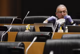 El diputado de Vox, Juan Luis Steegmann Olmedillas, se coloca una mascarilla durante la comparecencia del ministro de Sanidad, Salvador Illa, - Pool - Archivo