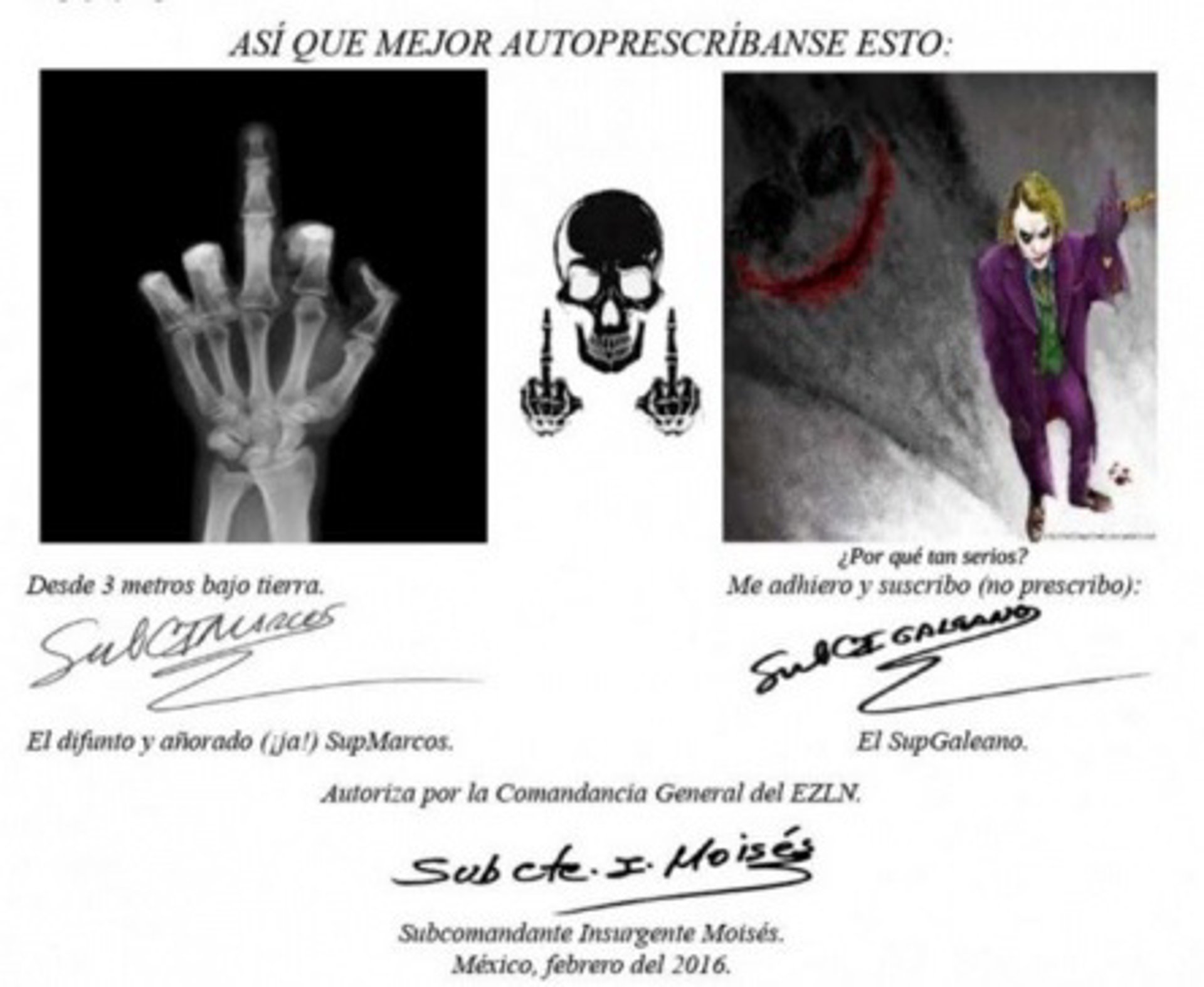 "Los únicos terroristas son quienes han mal gobernado este país desde hace más de 80 años", ha señalado el EZLN, en un documento firmado por la "comandancia general" y acompañado de una imagen de la radiografía de una mano levantando el dedo corazón, en señal de burla --con la firma del subcomandante Marcos y la leyenda "desde tres metros bajo tierra"--.