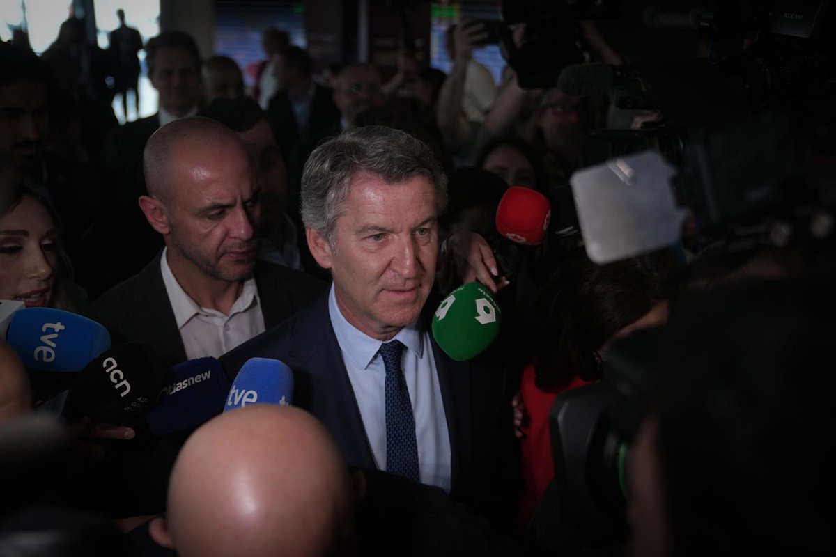 El presidente del Prtido Popular, Alberto Núéz Feijóo (c), a su llegada al European Pulse Forum 2026, a 10 de abril de 2026, en Barcelona, Catalunya (España). El foro, organizado por el periódico digital POLITICO & beBartlet, reúne a altos responsables po - David Zorrakino - Europa Press